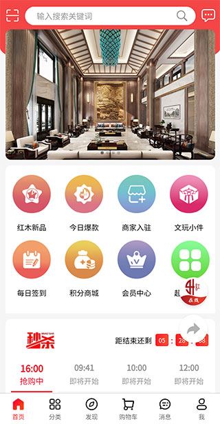 1、进入软件【首页】后,你可以看到常用功能,如红木新品、今日爆款、商家入驻等。