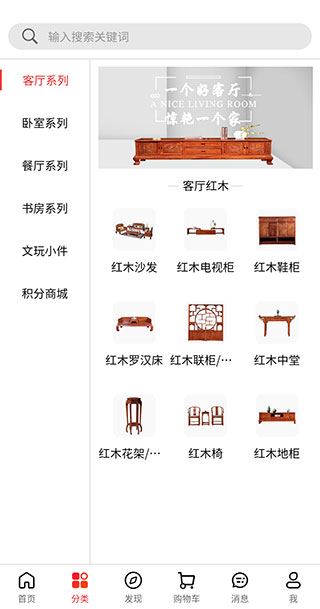 2、切换到【分类】页面,你可以看到许多商品分类,如客厅系列、卧室系列、餐厅系列等。