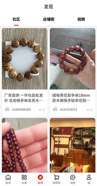 3、在【发现】页面,你可以看到很多用户动态,这些动态分为社区、店铺街和视频三大类。